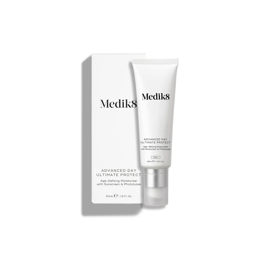 Medik8 Advanced Day Ultimate Protect is Medik8’s most advanced day cream, designed to provide superior sun protection, hydration, and defence against environmental ageing. This high-performance daily moisturiser combines advanced UV filters with DNA repair technology to help protect the skin from harmful UVA and UVB rays while supporting natural skin repair. The lightweight, nourishing formula absorbs effortlessly, delivering essential hydration and protection while leaving an invisible, comfortable finish suitable for all skin tones.