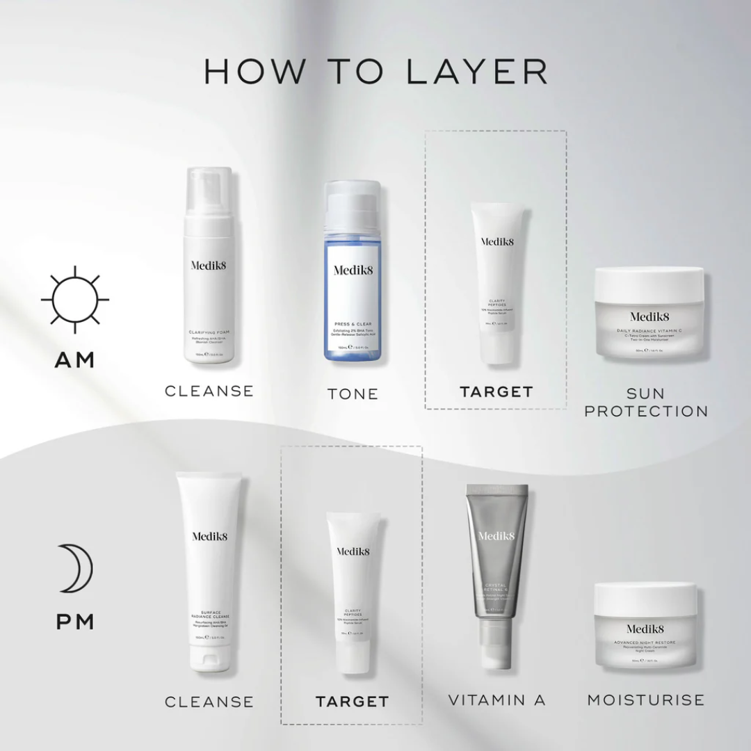 Medik8 Clarity Peptides is a lightweight clarifying serum designed to visibly improve skin clarity, reduce blemishes, and restore a healthy, radiant glow. Powered by a high-strength 10% niacinamide complex, this advanced formula helps balance oil production, refine pores, and calm visible redness while supporting the skin’s natural barrier. The fast-absorbing serum works to smooth and brighten the complexion, promoting clearer, more even-toned skin with a visibly luminous, glass-like finish.