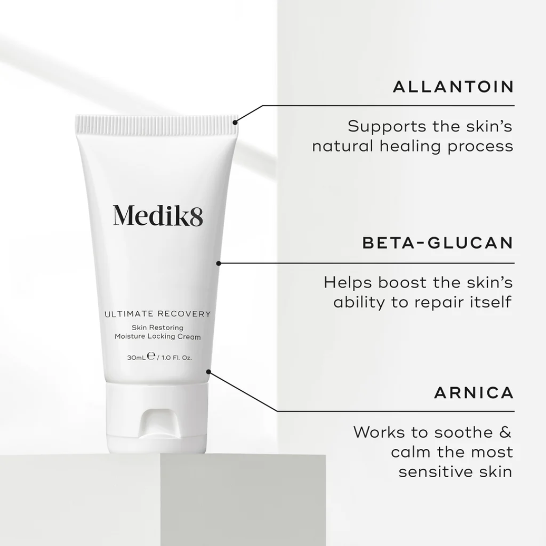 Medik8 Ultimate Recovery is a deeply nourishing moisture-locking cream designed to restore, protect, and comfort dry, compromised, or sensitised skin. This ultra-rich formula creates a protective barrier that helps shield the skin from environmental irritants while locking in essential moisture. Ideal for use after professional treatments or during periods of extreme dryness, the comforting texture helps calm and restore the complexion, leaving skin visibly healthier, smoother, and more resilient.